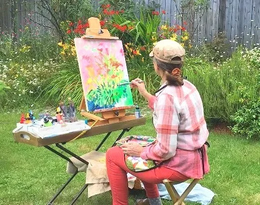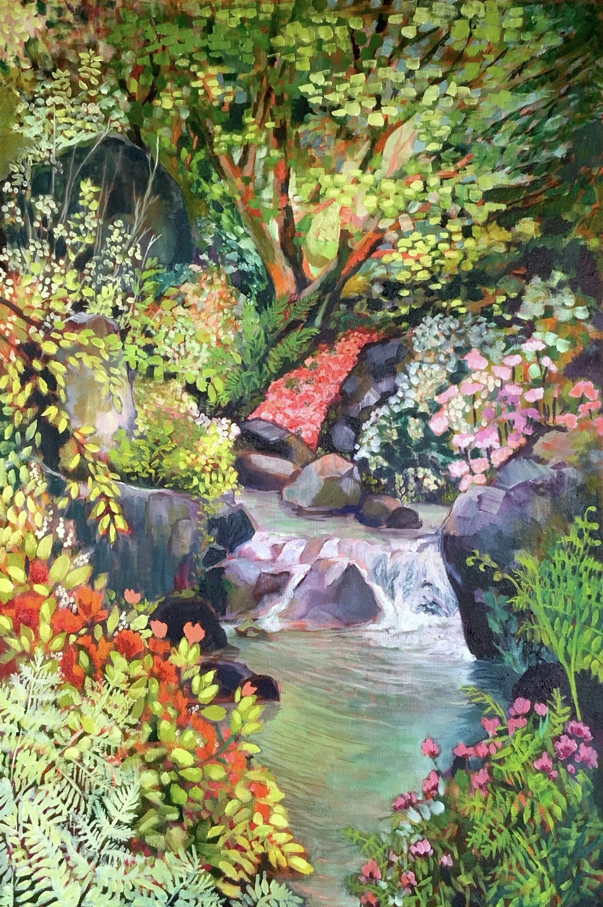 “Something magical happens when you paint outside, surrounded by nature. The brushstrokes mimic the gentle breeze while colors dance across the leaves and light. The true impact of the moment can be felt and seen as it’s translated into line, shape, and pattern.”